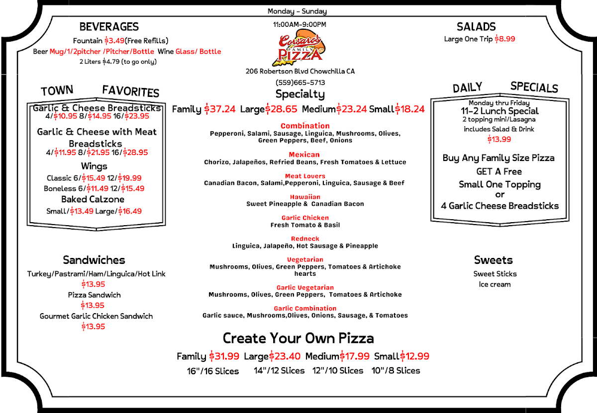 If you’re curious about what makes Corsaro's Family Pizza Menu such a local favorite in Chowchilla, just take a look at the lineup. Right on 206 W Robertson Blvd, this spot keeps things classic, hearty, and seriously satisfying. The pizzas are the main event, loaded with gooey cheese, rich tomato sauce, and toppings that don’t skimp. Whether you’re into a simple pepperoni or something piled high with meats and veggies, there’s plenty to get excited about.